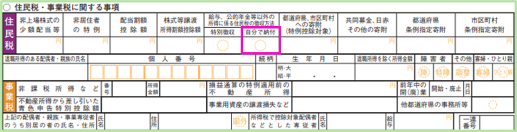 ライバー(ライブ配信)の所得にかかる住民税に普通徴収を選択するには確定申告書の第二表の一番下、「住民税・事業税に関する事項」に「自分で納付」と記載されている箇所に○をつける必要があります。